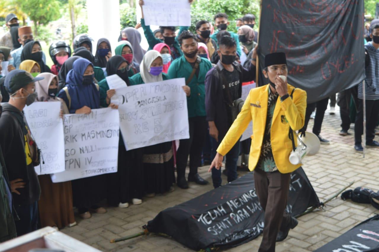 Dibawah guyuran hujan, ratusan masa tiba di Gedung DPRD Madina sekitar pukul 12.30 WIB, dengan membawa poster tulisan penolakan terhadap RUU Cilaka, dan juga keranda mayat.