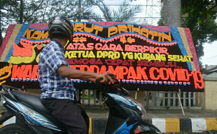 “Kami turut prihatin atas cara berfikir ketua DPRD yang kurang sehat. Semoga cepat sembuh”. Sepenggal kalimat tersebut tertulis di papan bunga yang berukuran panjang 3 meter dan lebar 2 meter. Papan bunga dikirim oleh warga yang terdampak COVID-19.