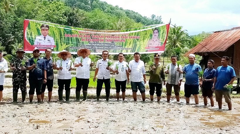 PADANGSIDIMPUAN-Wali Kota Padangsidimpuan Letnan Dalimunthe bersama Wakil Wali Kota Harry Pahlevi Harahap kompak tanam padi bersama di Kelurahan Panyanggar, Kecamatan Padangsidimpuan Utara.
