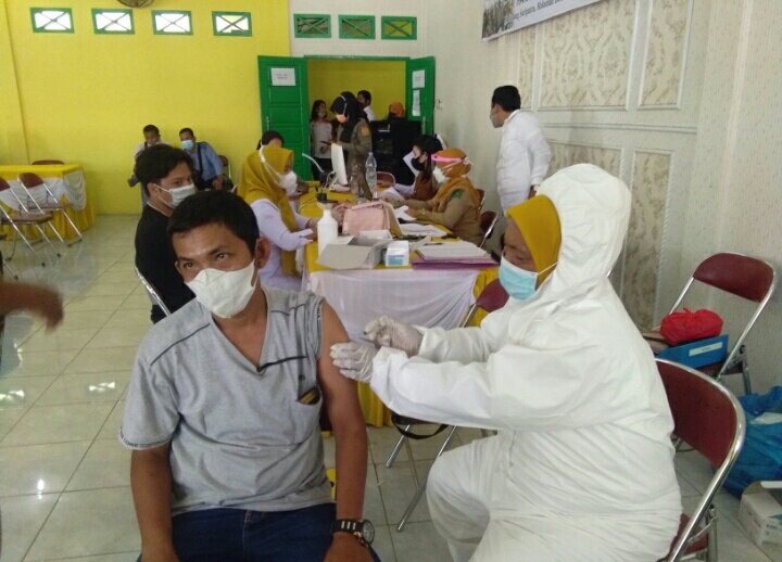 PADANGSIDIMPUAN-Sejumlah wartawan unit Polres Padangsidimpuan, Sumatera Utara (Sumut), divaksin di Kantor Camat Utara, Senin (26/7/21).