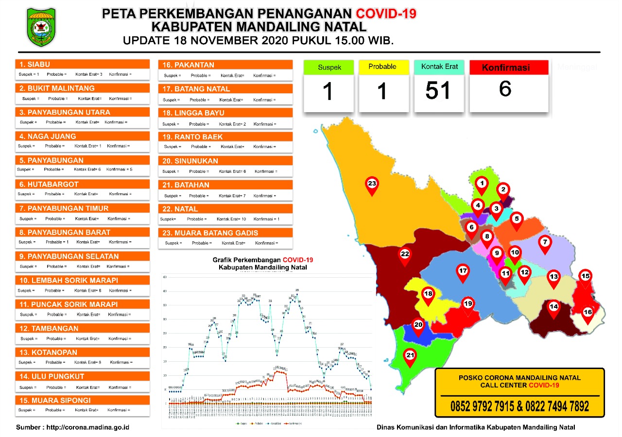 Dari data yang diterima dari satgas covid – 19 Madina per 18/11/2020 untuk jumlah terkonfirmasi ada 6 orang, kontak erat 51, probable 1, dan suspek 1 orang. Sebelumnya Madina masuk dalam zona merah, dimana pada bulan Oktober 2020 jumlah terkonfirmasi COVID-19 paling banyak hingga mencapai 115 orang. (zn)