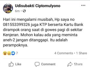 “Hari ini mengalami musibah, HP saya no 081553399326 juga KTP beserta Kartu Bank dirampok orang saat gowes pagi di sekitar Kenjeran,” kata Udisubakti di Facebook.