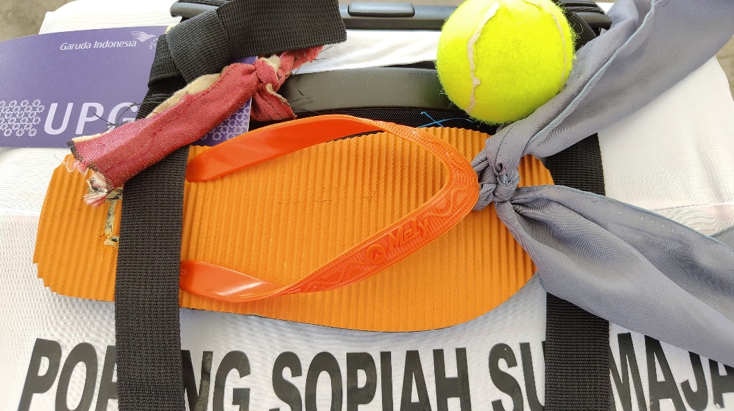 Pemandangan menarik pun tersaji, ada koper yang dihiasi boneka lucu tergantung di pegangan, ada pula yang diikat dengan kain perca warna-warni, hingga yang paling mencuri perhatian koper bertanda sandal jepit mencolok.