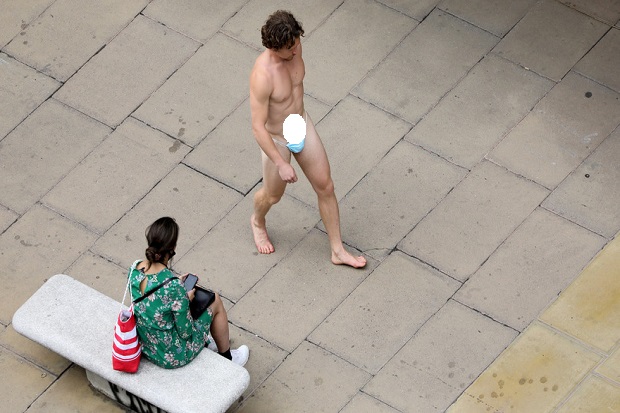 Spontan, aksi itu membuat heboh para pembeli di Oxford Street London. Dia jadi tontonan banyak orang karena menjadikan masker layaknya celana dalam.