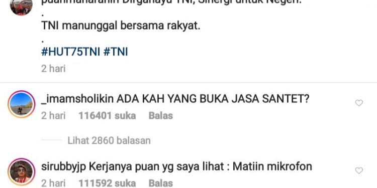 Postingan foto terakhir Puan Maharani yang menuliskan Dirgahayu TNI, Sinergi untuk negeri, TNI manunggal bersama rakyat dibanjiri cibiran pedas dari netizen.