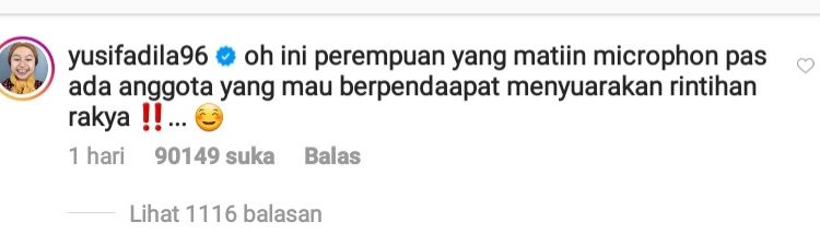 Salah satu komentar tegas muncul dari akun traveler/ vlogger @yusifadila96 “oh ini wanita yang matikan mikrofon pas ada anggota yang mau berpendapat menyuarakan rintihan rakyat”. []