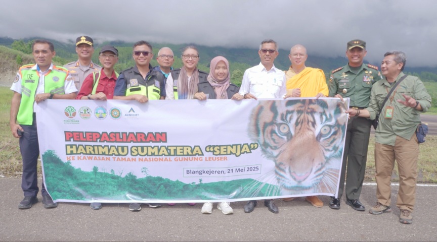 ACEH (LENSAKINI)– PT Agincourt Resources, pengelola Tambang Emas Martabe, Batangtoru, Tapsel, mendukung pelepasliaran harimau Sumatra (Panthera tigris sumatrae) bernama “Senja” ke habitat alaminya di kawasan konservasi Kedah, Taman Nasional Gunung Leuser, Aceh, 21 Mei 2025.