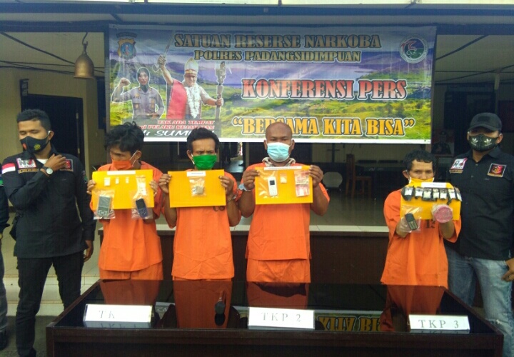PADANGSIDIMPUAN-4 orang jaringan narkoba di Kota Padangsidimpuan, Sumatera Utara (Sumut), ditangkap Satres Narkoba Polres Padangsidimpuan, Kamis (6/8/2020), di tiga lokasi yang berbeda.