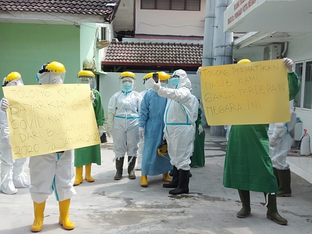 Para perawat covid-19 ini melakukan aksinya dengan menggunakan pakaian asmat dan Alat Pelindung Diri (APD) lengkap dengan berkeliling rumah sakit Pirngadi Medan.Salah seorang perawat, Buala Zenrato mengatakan sejak mereka bertugas merawat para pasien covid-19 baru 2 bulan intensif mereka di bayarkan, sehingga menunggak 8 bulan yang mereka katakan harusnya setiap bulan menerima Rp 7 juta.