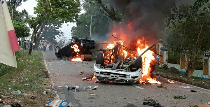 MANDAILING NATAL-Aksi unjuk rasa warga Desa Mompang Julu, Kabupaten Mandailing Natal (Madina), Sumatera Utara (Sumut), berlanjut. Hingga saat ini, dua unit mobil dikabarkan dibakar oleh massa yang sudah marah.