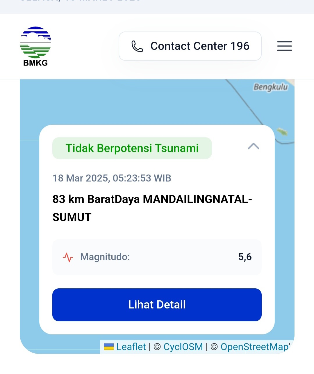 PADANGSIDIMPUAN-Kabupaten Mandailing Natal (Madina), Sumatera Utara diguncang gempa berkekuatan 5,6 Magnitudo,