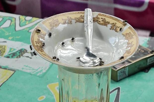 Kerumunan lalat dapat terlihat dimana-mana termasuk di sebuah warung kopi dipenuhi lalat hijau yang hinggap di setiap sudut warung, terutama hinggap di makanan dan minuman.