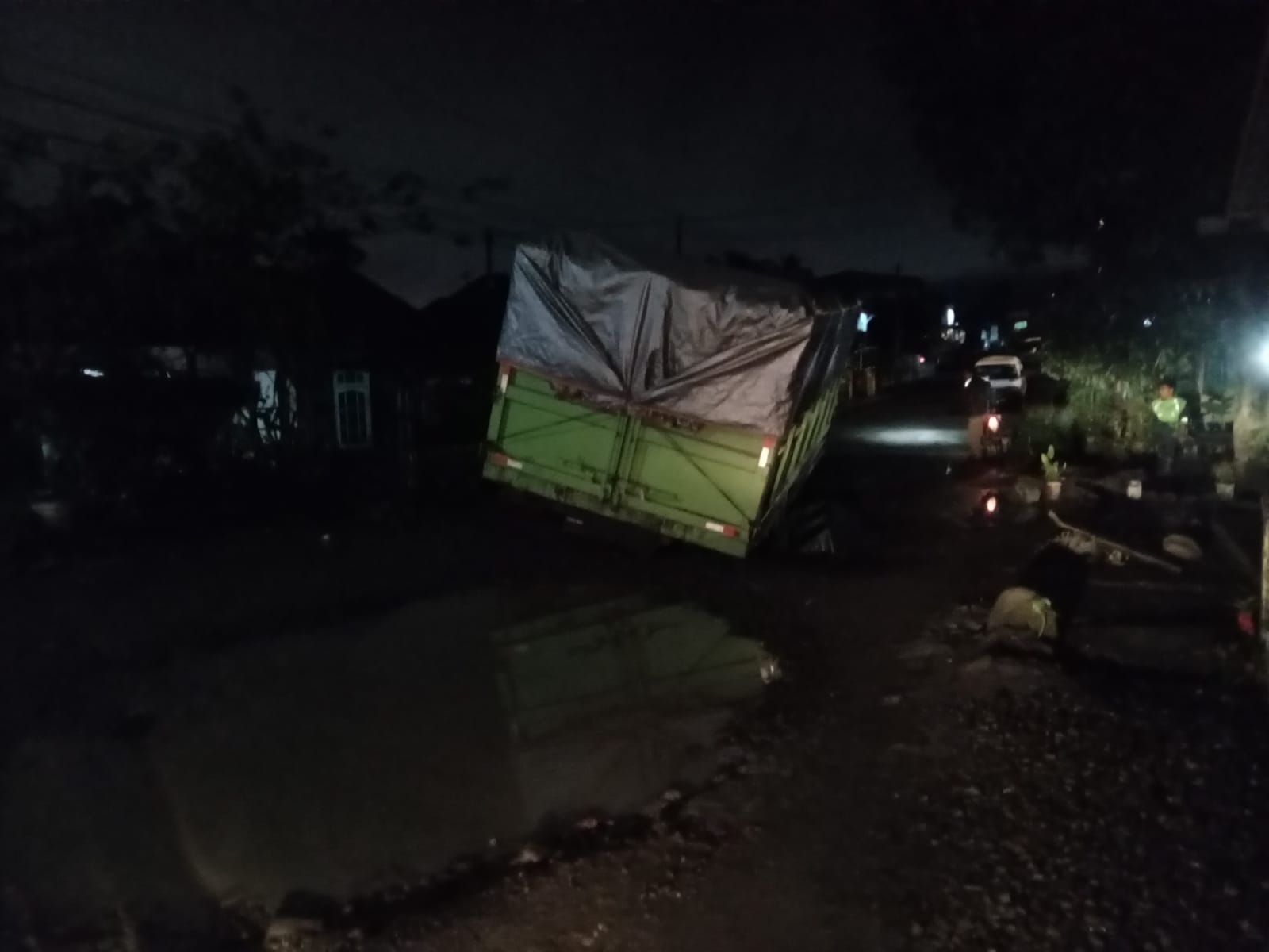 Pantauan wartawan, sekitar pukul 00.30 WIB terlihat satu unit mobil truk yang datang dari arah Mandailing Natal menuju Sibabangun, KabupatenTapanuli Tengah, Sumatera Utara, terjebak di badan jalan yang mengalami rusak parah dan berlubang.