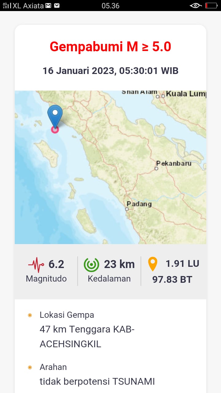 Berdasarkan informasi dari BMKG, gempa terjadi pada pukul 05.30 WIB, dengan lokasi 1.91 LU, 97.83 BT (47 km Tenggara Kabupaten Aceh Singkil, Provinsi Aceh.
