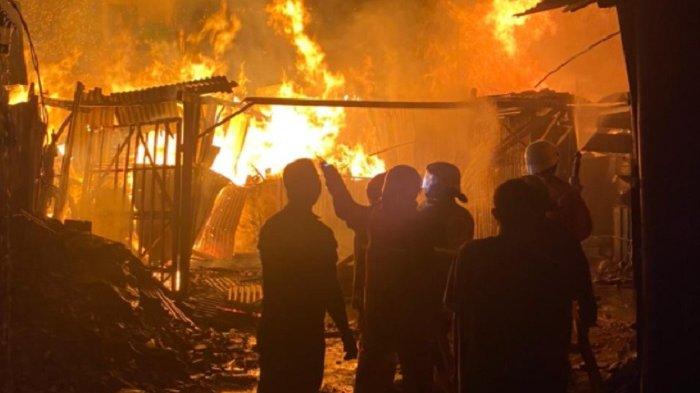 SIMALUNGUN-Warga yang sedang berada di lokalisasi Bukit Maraja, Simalungun, Sumatra Utara (Sumut), mendadak panik melihat sejumlah bangunan terbakar di tempat itu, Kamis (30/9/2021). Akibatnya, dua bar ludes terpanggang.