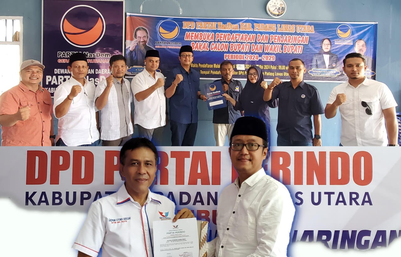 PADANG LAWAS UTARA- Mantan Ketua Himpunan Pengusaha Muda (HIPMI) Kota Padangsidimpuan mendaftar ke tiga partai sebagai Bakal Calon Kepala Daerah (Bacakada) Kabupaten Padang Lawas Utara (Paluta), Minggu (5/5/2024).