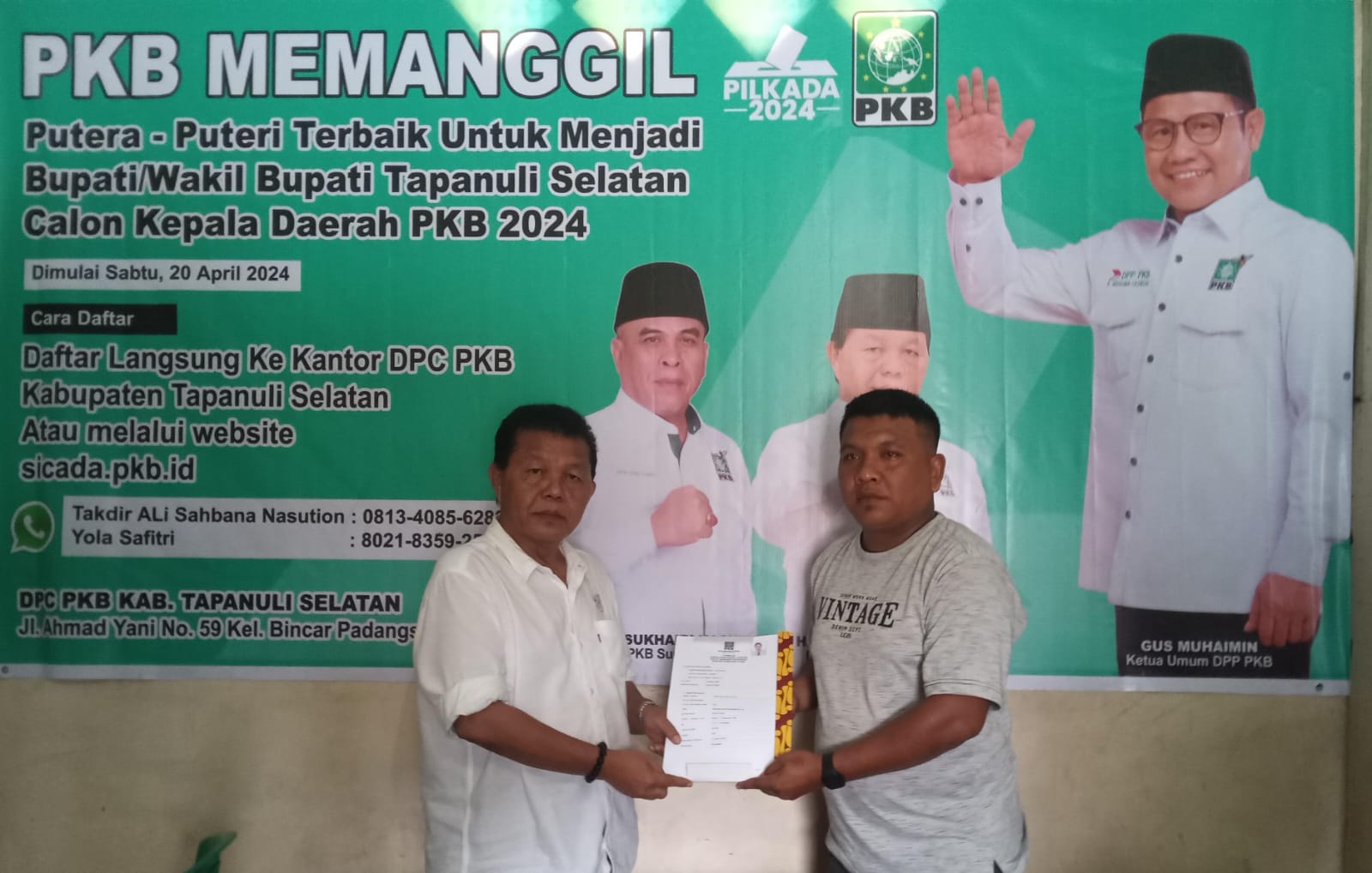 Sekira pukul 16.00 WIB, Tim pemenangan Ja’far Sahbudin Ritonga menyerahkan berkas formulir Bacakada Tapsel ke kantor sekretariat DPC PKB Tapanuli Selatan di Jalan MT Haryono, Kecamatan Padangsidimpuan Utara, Kota Padangsidimpuan.