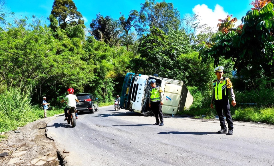 Sejumlah Polantas Polres Padangsidimpuan, Polda Sumatera Utara, terlihat di lokasi tergulingnya truk tersebut guna mengatur lalu lintas agar tidak terjadi kemacetan.