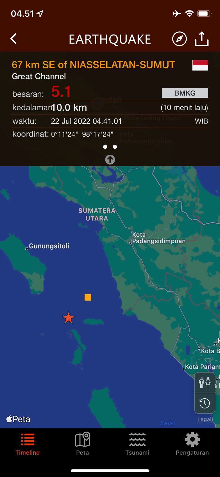 PADANGSIDIMPUAN-Gempa berkekuatan magnitudo 5,1 terjadi di Tenggara Nias Selatan, Sumatera Utara, Jumat (22/7).