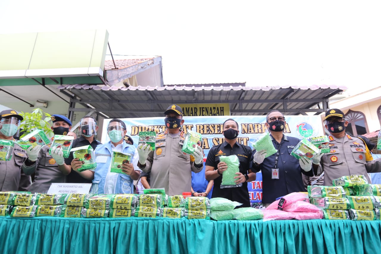 Kapolda Sumut mengatakan dari hasil barang bukti yang disita berupa 100 kg Sabu berhasil menyelamatkan 1 juta anak bangsa serta 50 ribu butir pil ekstasi berhasil menyelamatkan 50 ribu anak bangsa.