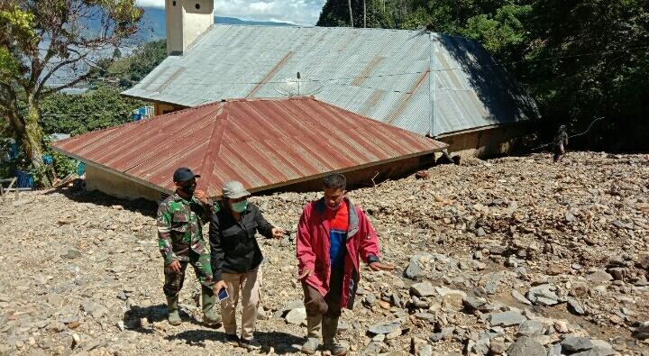 ” Satu gereja tertimbun material longsor, hingga saat ini warga masih berupaya membersihkan tanah berlumpur yang hampir menutupi seluruh bangunan gereja,” sebut Eva.
