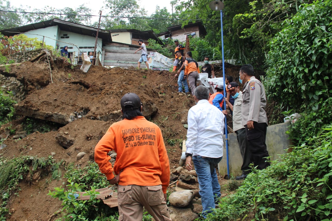 PADANGSIDIMPUAN-Longsor terjadi di Gang Air Bersih, Lingkungan III, Kelurahan Sitamiang Baru, Kecamatan Padangsidimpuan Selatan, Kota Padangsidimpuan, Sumut, Kamis (19/8/2021).