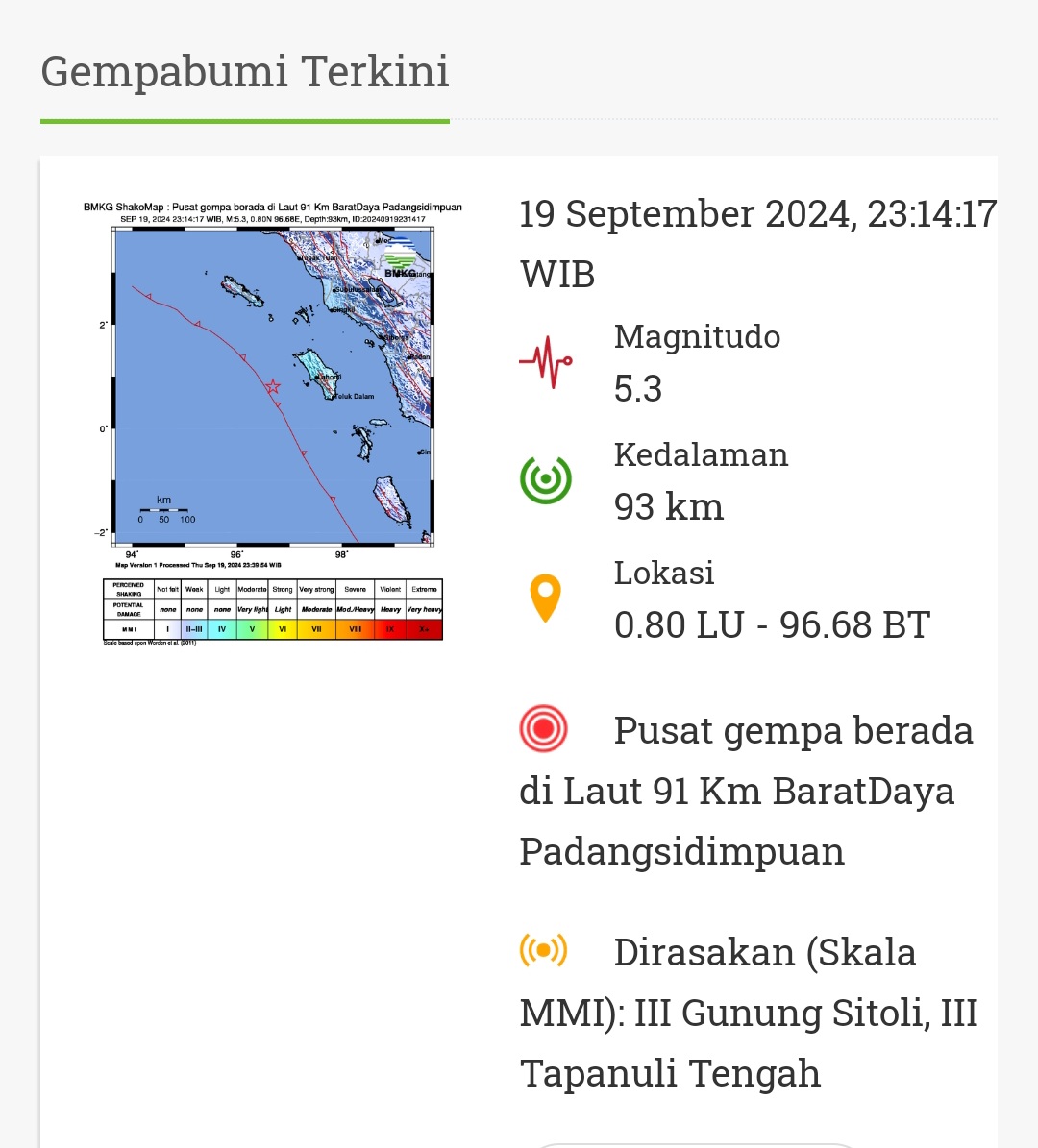 Gempa ada pada kedalaman 93 KM kilometer.”Gempa Mag 5,3. Lokasi gempa 91 kilometer Barat Daya Padangsidimpuan, demikian informasi yang disampaikan BMKG, Kamis (19/9/2024).