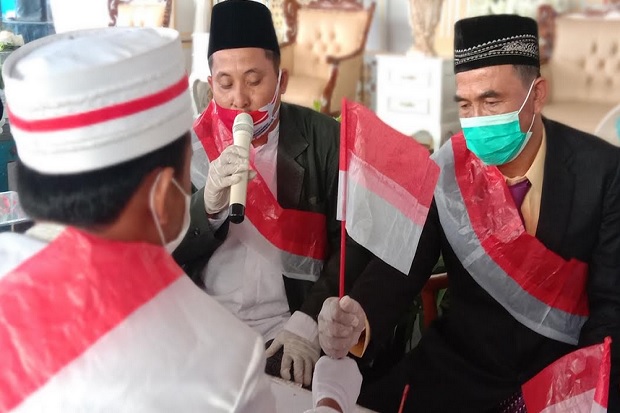 BENGKULU UTARA – Mengantisipasi penyebaran COVID-19, pengantin di Kabupaten Bengkulu Utara, Provinsi Bengkulu melangsungkan akad nikah menggunakan tongkat bendera, Minggu (16/8/2020). Pernikahan unik ini dilangsungkan satu hari jelang perayaan perayaan HUT Ke-75 Kemerdekaan Republik Indonesia.