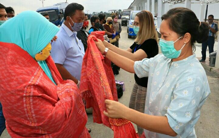 Pemulangan kedua pasien sembuh ditandai dengan penyematan hiou atau ulos dan pemberian bingkisan sebagai tanda pemberi semangat dan rasa sukacita atas kesembuhannya.