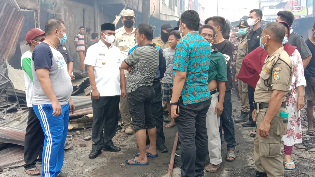 Bupati Sergai H. Darma Wijaya yang langsung meninjau ditengah-tengah puing-puing sisa kebakaran. Bupati tampak memberikan semangat kepada para pedagang yang mengalami musibah kebakaran.