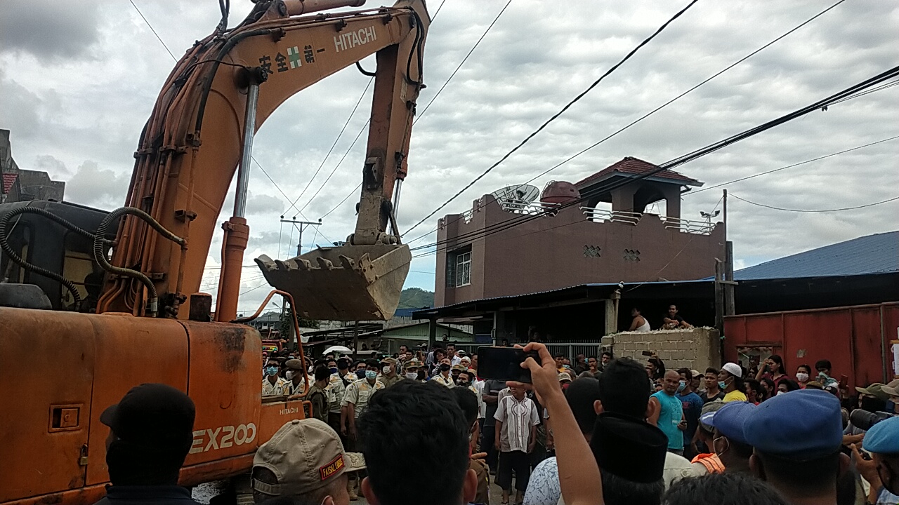 Satpol PP terlihat datang ke lokasi itu dengan membawa satu unit alat berat pada pukul 15.30 WIB, Warga yang telah menunggu di lokasi menolak kedatangan petugas dengan berkumpul.