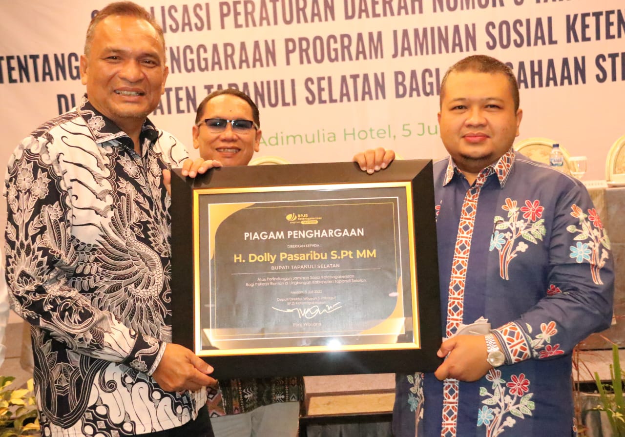 TAPANULI SELATAN- Setelah menerima penghargaan dari Bank Indonesia, pada Selasa (5/7), ternyata di hari yang sama Bupati Tapanuli Selatan, Dolly P.Pasaribu SPt MM kembali lagi menerima penghargaan dari BPJS Ketenagakerjaan.