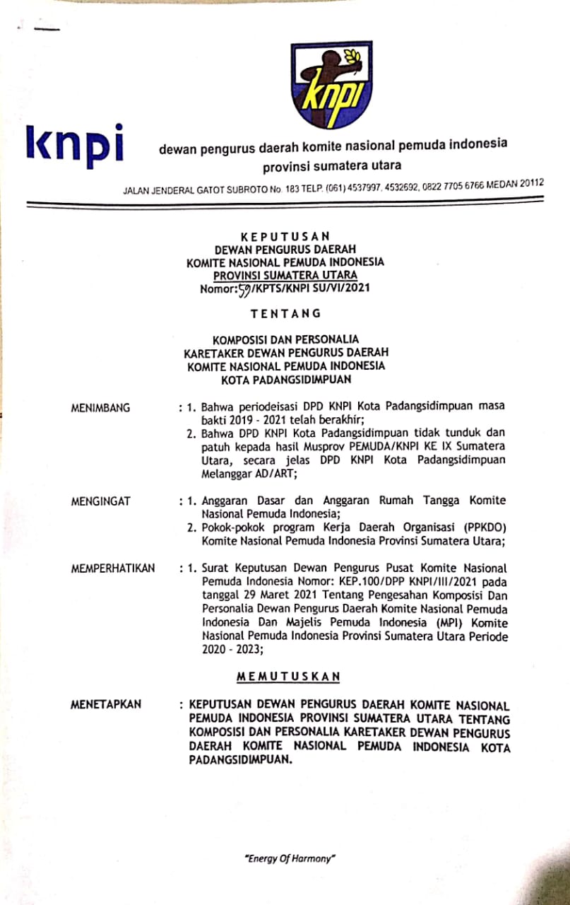 Penunjukan tersebut mengacu kepada surat keputusan DPD KNPI Sumut nomor. 59/KPTS/KNPI SU/VI/2021. “Surat tentang karateker kepengurus DPD KNPI Padangsidimpuan sudah ditanda-tangani pada 9 Juni 2021,”ujar Toto kepada LENSAKINI.com, ketika ditemui.