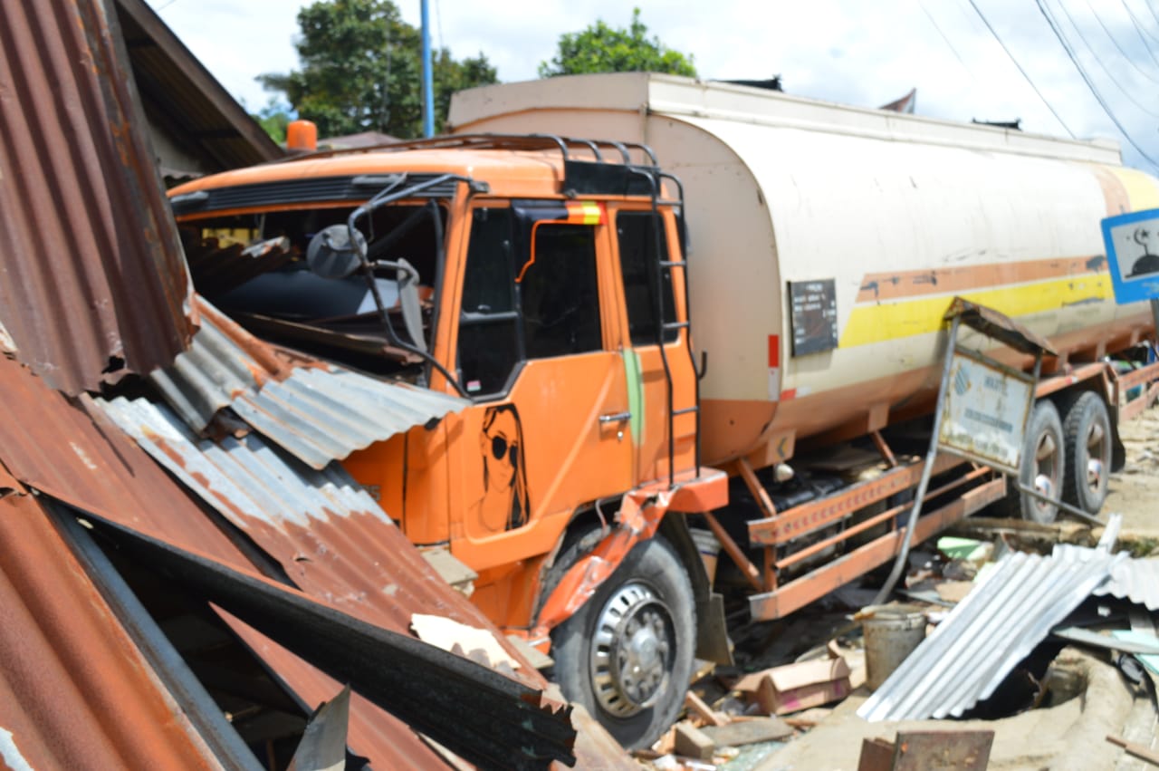Saat ingin melihat suara keras tersebut tiba tiba truck pengangkut CPO langsung menabrak warung miliknya.