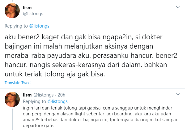 “Di situ si dokter masih ngikutin aku sampai departure gate, aku cuma bisa diam mematung. takut, hancur, sedih, semua perasaan jadi satu. bener-bener ga bisa ngapa-ngapain, jangankan untuk minta pertolongan, untuk menghindar/melawan aja gak bisa,” tutupnya.