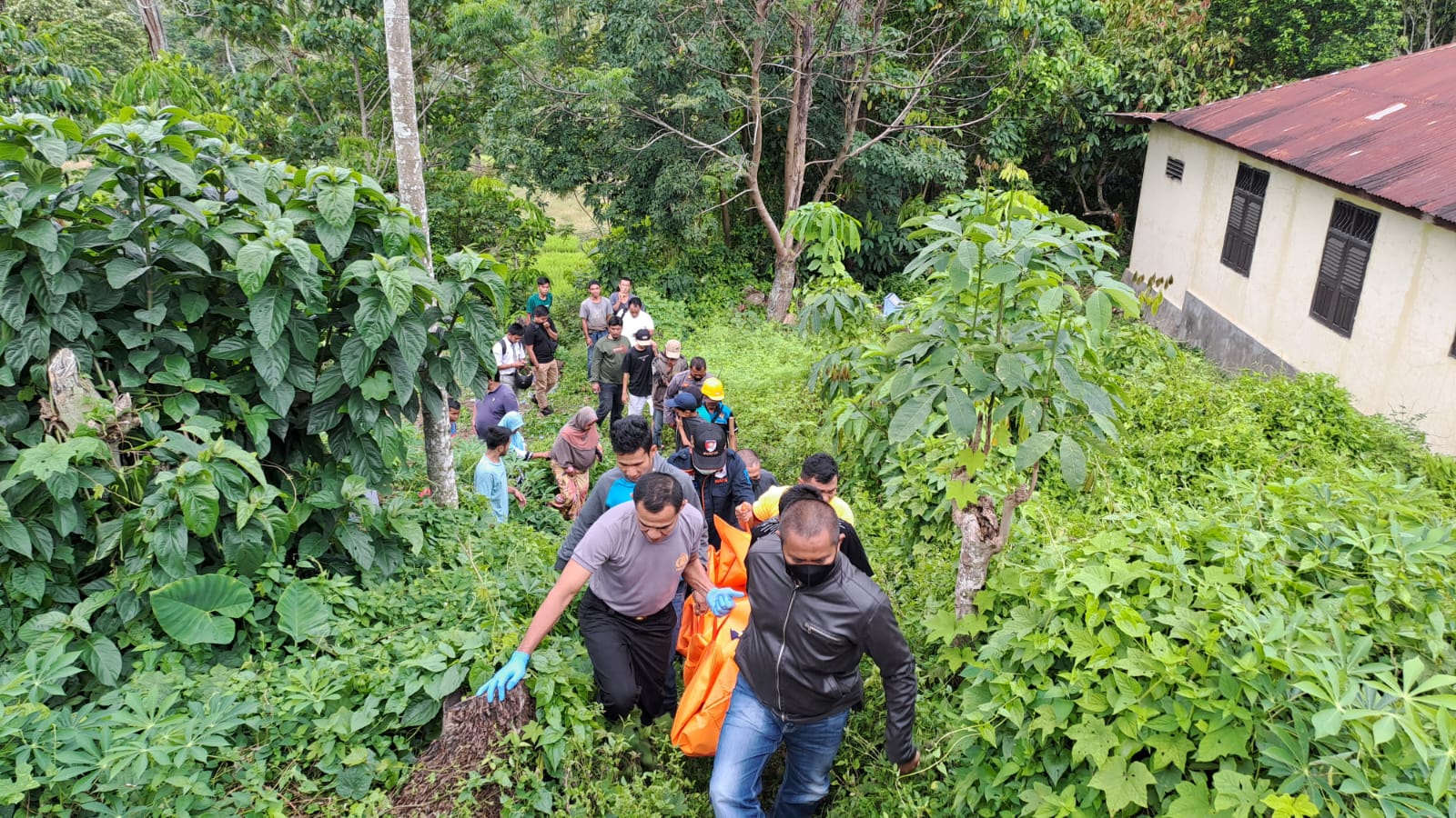 Tangis Rolansyah salah seorang keluarga korban tidak dapat dibendung ketika menyaksikan mayat sudah tergeletak di kebun tidak jauh dari dari rumah warga. Ketika ditemukan, mayat tersebut memakai baju warna ungu dengan celana berwarna hitam.