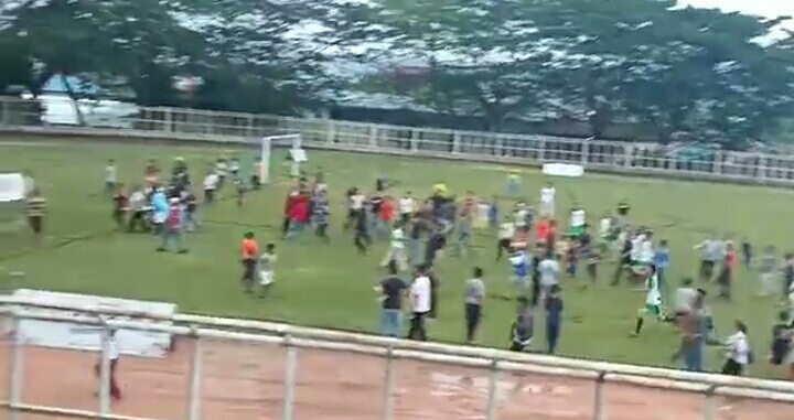 PADANGSIDIMPUAN-Pertandingan sepak bola antara Bonsita FC versus JDS FC di Stadion HM Nurdin Nasution, Kota Padangsidimpuan, Sumatera Utara (Sumut), berakhir ricuh.