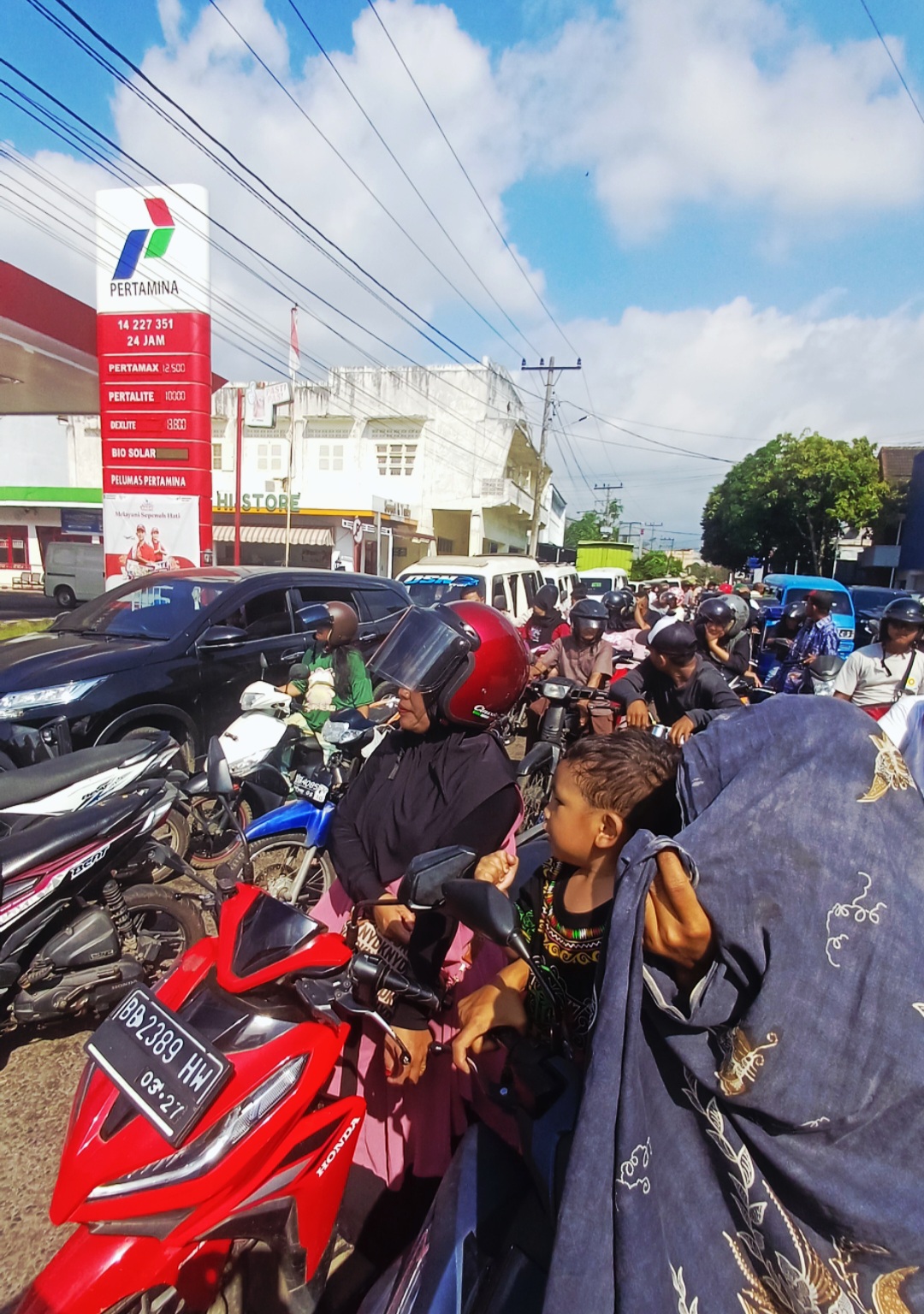 Para pengendara yang mengantri banyak yang belum sarapan pagi untuk mendapatkan minyak di SPBU. Bahkan, ada pengendara yang rela membawa balitanya ikut mengantri.