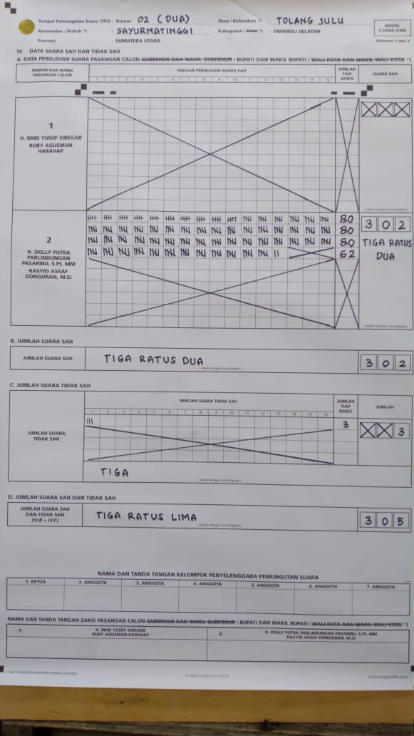 Sedangkan di TPS 2 Tolang Julu, Kecamatan Sayur Matinggi, pasangan nomor urut 1 tidak ada meraup suara. Sementara Dolly-Rasyid meraup 302 suara dari total suara yang masuk 302 suara.