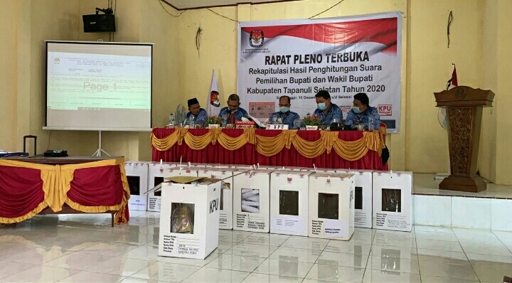 TAPANULI SELATAN-Komisi Pemilihan Umum (KPU) Kabupaten Tapanuli Selatan (Tapsel), Sumatera Utara (Sumut) melaksanakan rapat pleno terbuka rekapitulasi hasil pemungutan dan penghitungan suara pemilhan umum kepala daerah/wakil kepala daerah, Selasa (15/12/2020).