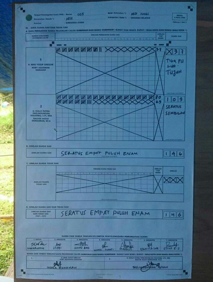 Dari data yang dihimpun, pasangan Dolly-Rasyid meraup 151 suara di TPS 4. Sedangkan pasangan nomor urut 1, M Yusuf Siregar dan Roby Agusman Harahap sebanyak 131 suara dari total suara yang masuk 286.
